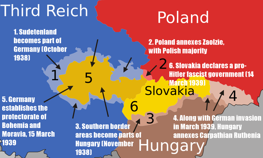 For their neutrality Poland and Hungary were subsequently rewarded with chunks of Czechoslovakia: Hungary obtained a southern portion of Slovakia while Poland took the areas with a Polish minority. Czechoslovakia’s Soviet alliance was abolished and the Communist Party outlawed. Anti-Nazi refugees from Sudetenland were rounded up by the new government in Prague and handed over to the Germans to be destroyed. The stipulated guarantee of the rump of Czechoslovakia was ignored. As for the promised referenda, they were simply forgotten.