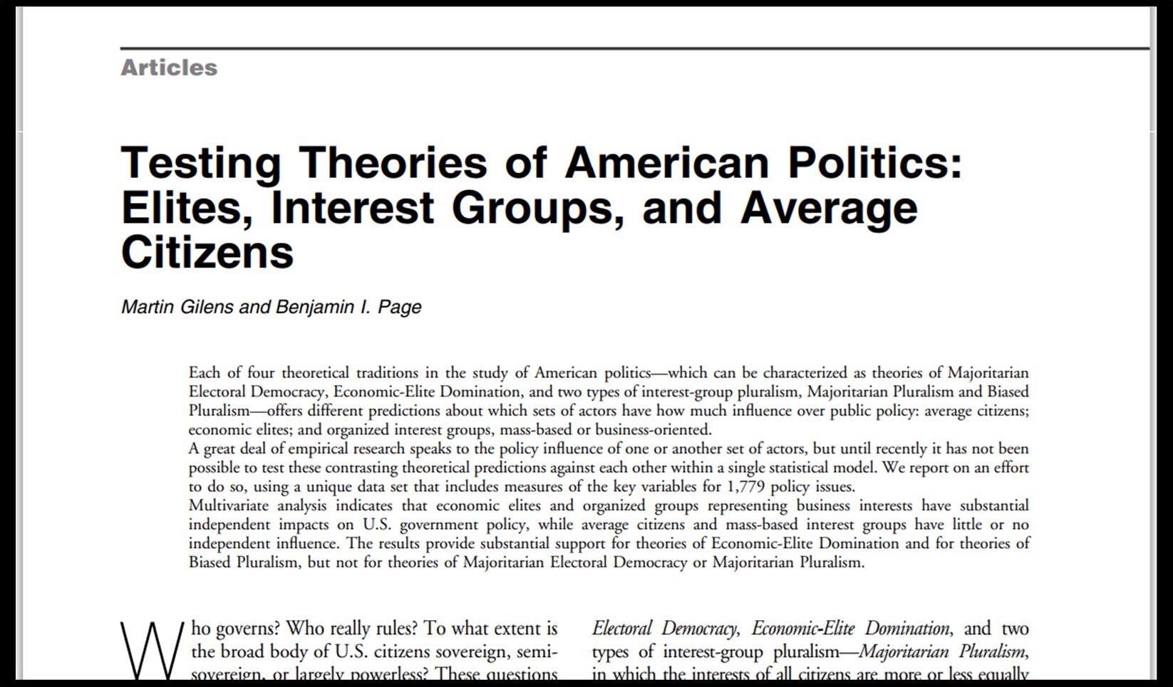 A subsequent study titled “Testing Theories of American Politics: Elites, Interest Groups, and Average Citizens“ by professors Martin Gilens of Princeton University and Benjamin I. Page of Northwestern University confirmed Hayes’ findings. Gilens and Page reviewed nearly 1,800 national surveys on public policy changes between 1981 and 2002. They concluded that, “Not only do ordinary citizens not have uniquely substantial power over policy decisions; they have little or no independent influence on policy at all.”