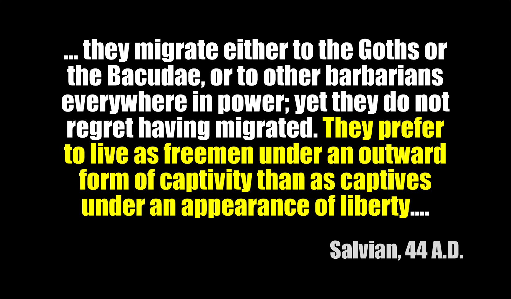 “they migrate either to the Goths or the Bacudae, or to other barbarians everywhere in power; yet they do not regret having migrated. They prefer to live as freemen under an outward form of captivity than as captives under an appearance of liberty….”[3]